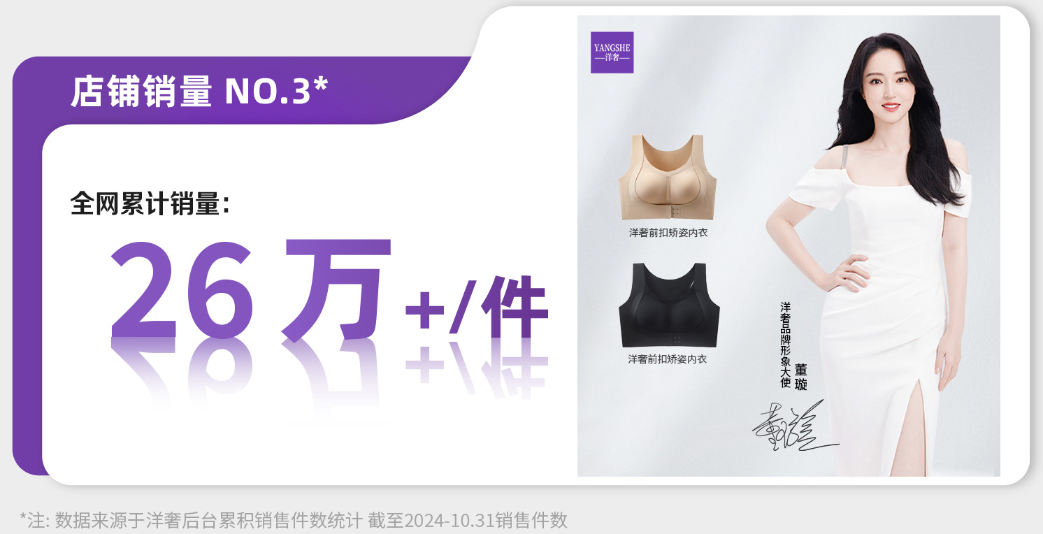 点击了解更多 > >YANGSHE洋奢成立于2019年,始终坚持用户需求至上的理念,回归用户真实的穿着痛点,聚焦个性化诉求,为不同身材的消费者找到适合自己的内里服饰穿搭,彰显女人的自信与魅力。